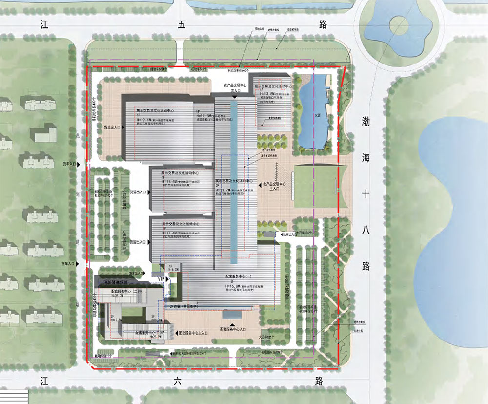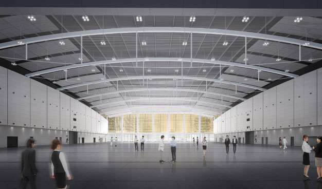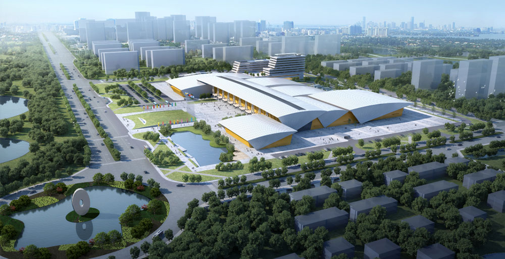 博览中心总建筑面积107030㎡,其中地上81455㎡,地下25575㎡。包括10000㎡主展厅1个、6000㎡展厅2个,及4000㎡展厅1个,总共可容纳展位720个左右。室外设置展场面积约10000㎡,用于各类室外宣传、展览活动,平时兼作为市民休闲广场。会议区另有1个多功能厅、1个中型会议室、6个小型会议室、2个新闻中心、1个接待室及其他附属设施。